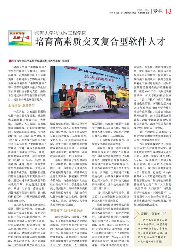 2021年5月,物联网工程学院陈慧萍老师接受了工信部主流媒体“中国信息化周报”专访, 2021年6月7日发行的“中国信息化周报”(18总1419期)设置专栏介绍了物联网工程学院的人才培养模式, 题为“培育高素质交叉复合型软件人才”,介绍了学院产教融合培养复合型软件人才模式。