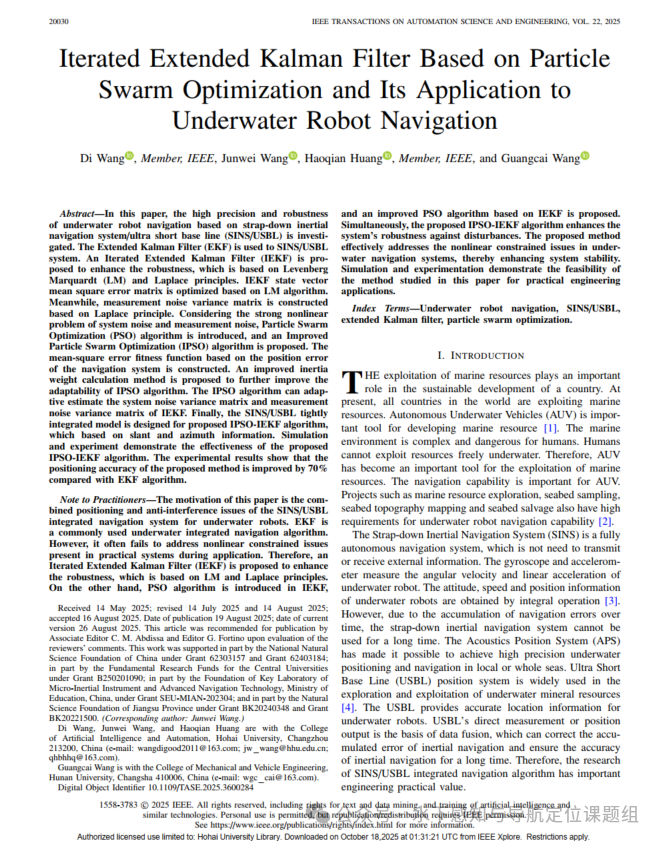 近日,学院先进导航与智能感知课题组王迪副教授的研究论文“Iterated Extended Kalman Filter Based on Particle Swarm Optimization and Its Application to Underwater Robot Navigation”(基于粒子群优化的迭代扩展卡尔曼滤波及其在水下机器人导航中的应用)以长文(Full Paper)形式录用在控制领域顶刊《IEEE Transactions on Automation Science and Engineering》(IEEE TASE)上。该论文提出了一种新颖的水下机器人SINS/USBL组合定位方案用于复杂水下场景。yl88858cc永利官网王迪副教授为论文的第一作者,王俊玮老师为通信作者。河海大学为论文的第一作者单位,湖南大学为合作单位,该研究得到了国家自然科学基金等项目的资助。论文研究了基于惯性导航系统/超短基线(SINS/USBL)的水下机器人导航的高精度与鲁棒性问题。基于Levenberg Marquardt与拉普拉斯原理提出迭代扩展卡尔曼滤波器(IEKF)以增强鲁棒性。针对系统噪声与测量噪声的强非线性问题,提出改进型粒子群优化(IPSO)算法。构建基于导航系统位置误差的均方误差适应度函数,提出改进型惯性权重计算方法以进一步提升IPSO算法适应性。最终基于斜距与方位信息,为所提IPSO-IEKF算法设计了SINS/USBL紧耦合模型。仿真与实验验证了所提算法的有效性。